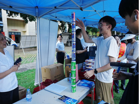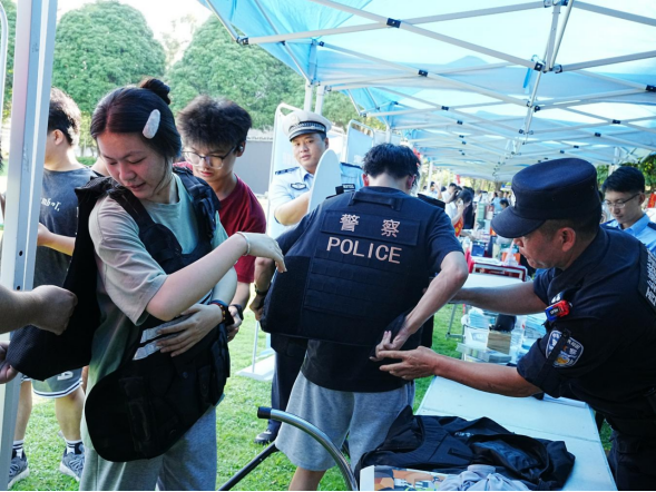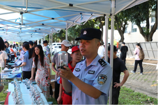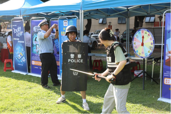 宣讲环节结束后,全体师生移步至大草坪,参与“双驱动平安基层行”沙龙活动。在游园互动区,校警双方共同设置了反诈圈套识别、安防灯谜竞猜、反诈大转盘、毒品样本辨识、交通安全小游戏等趣味互动项目,让师生在轻松的体验中潜移默化地学习反诈与禁毒知识,真正实现“寓教于乐”的宣传效果。装备展示区则陈列了警用无人机、警械、警叉、盾牌、防暴服等装备,直观展现了警方维护安全的专业能力,进一步增强了师生对公安工作的认同与信任。