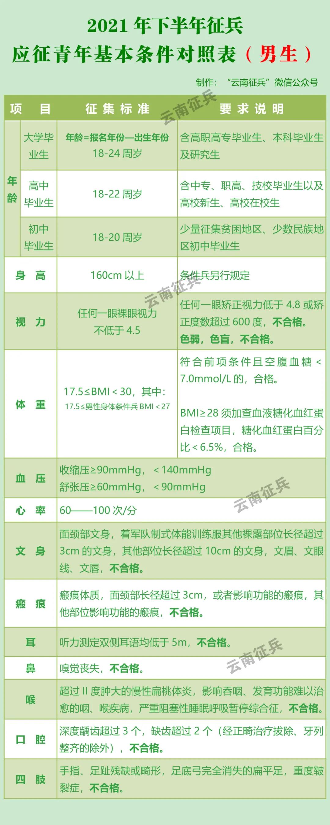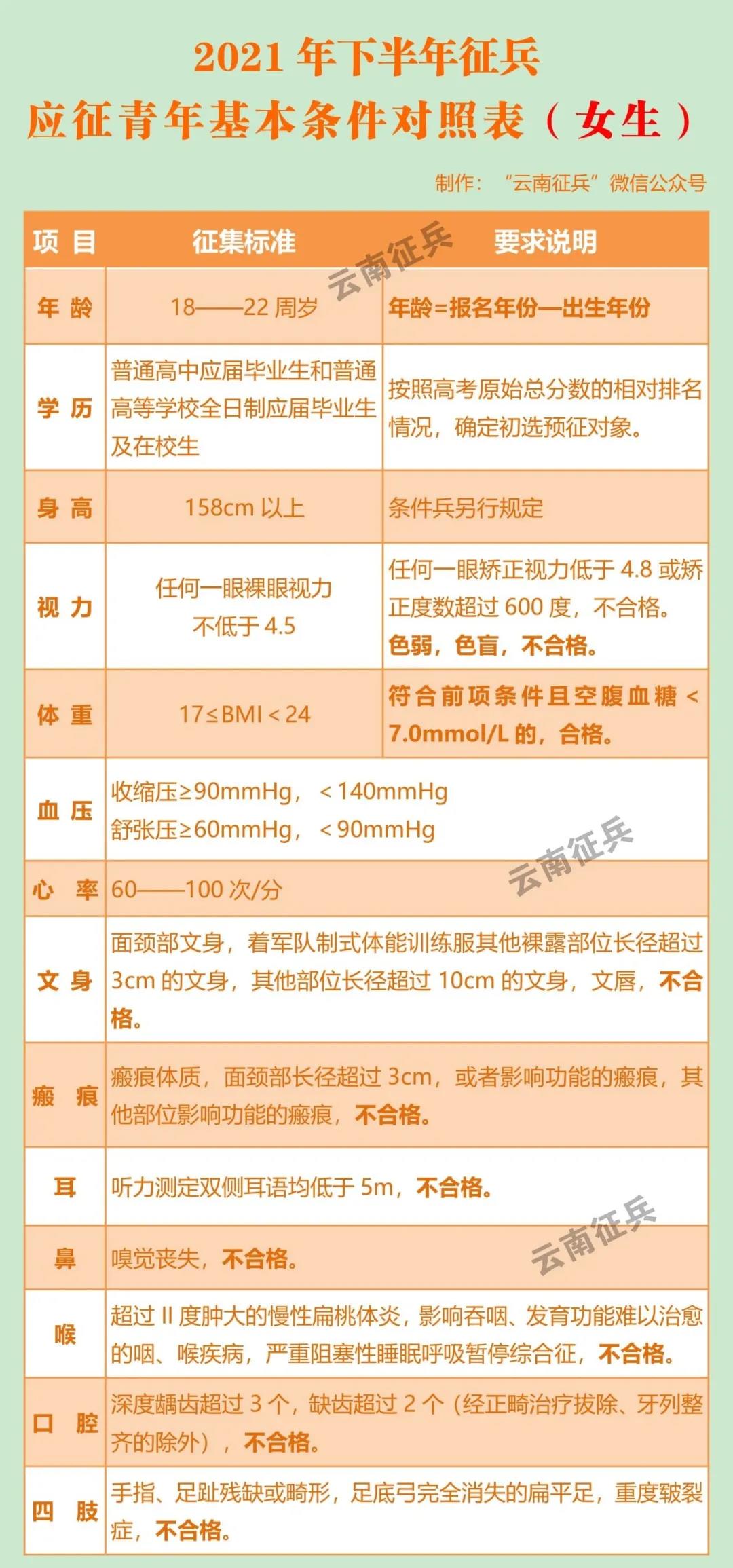 戴眼镜还能参军吗? 我还差几个月满18岁能报名吗?有文身是不是就一定不能参军? …… 为了解答大家的疑惑 云南省征兵办公室制作了征兵常见问题的对照表方便大家对照查看 一起来看
