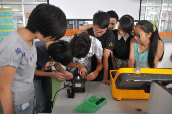 移动通信技术专业学生正在学习操作光纤熔接