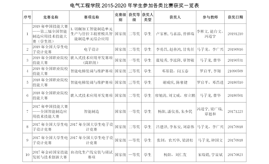 电气工程学院2015-2020师生参加各类竞赛获奖情况