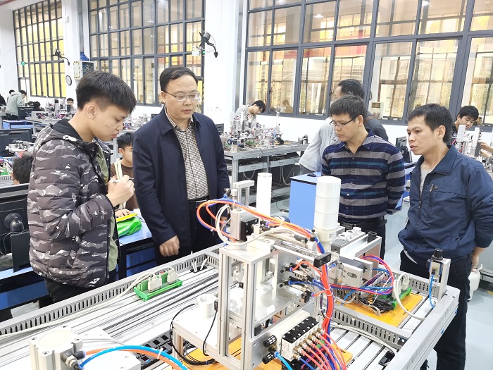 叶主任一行首先参观了我系电气类实验、实训基地,并就参加自动化生产线安装与调试区级技能大赛的备赛情况、比赛经验等方面与我系相关指导教师及备赛学生选手进行了深入的交流。