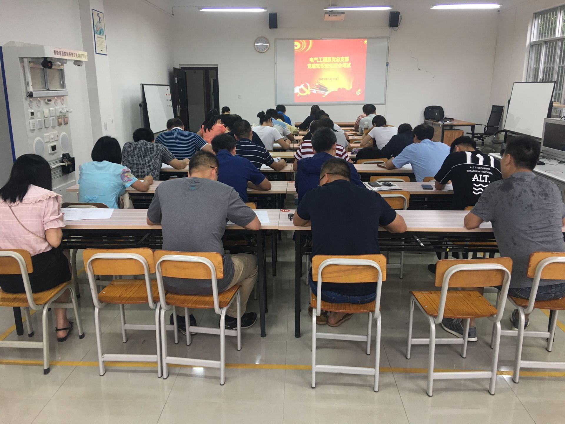 为深入学习贯彻习近平新时代中国特色社会主义思想和党的十九大精神,推动“两学一做”学习教育常态化,提高党员政治思想觉悟和理论学习水平, 5 28 日下午,电气工程系党总支在系办公楼组织全体党员开展了党建知识竞赛。竞赛采取闭卷形式,以填空题、简答题两大题型为主,内容涵盖党的十九大知识、 2019 年全国两会知识、《中国共产党重大事项请示报告条例》、《中国共产党支部工作条例(试行)》、《中国共产党纪律处分条例》以及扶贫知识、扫黑除恶专项斗争知识等。