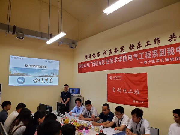 本次活动得到南宁轨道交通运营分公司维修中心的大力支持,南宁轨道交通运营分公司维修中心主任周航、运营分公司维修中心机电一分中心经理廖龙飞、运营分公司维修中心分团委书记余祖鑫等相关领导同志在自动化二班会议室热情地接待了我支部党员一行。