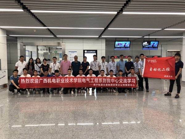 为进一步贯彻习近平总书记在党的十九大报告中指出的“深化产教融合”,为进一步丰富我系学生党支部学习交流活动, 4月24日,我系学生党支部组织党员和入党积极分子以及教师代表共赴南宁轨道交通集团运营分公司维修中心,以参观学习与座谈交流的方式开展了党支部结对共建活动。活动由南宁轨道交通运营分公司维修中心主任周航与电气系党总支部副书记喻宁娜牵头,学生党支部副书记玉洁琼、机电一体化技术专业带头人李翔等师生代表参加活动。