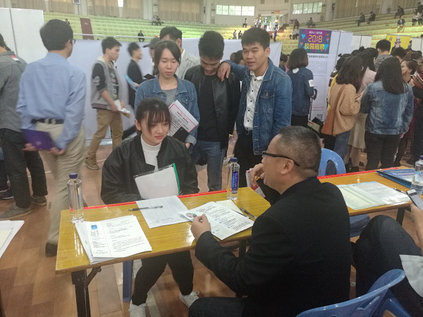 参加我院2018届毕业生双选会的招聘单位人员给学生介绍单位情况