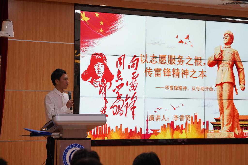 最后,覃伟纳书记对此次比赛作出点评,他对参赛选手的参与热情、精心准备及精彩表现给予了充分肯定与表扬,同时鼓励同学们一要心中有信仰,肩上有担当,脚下有方向,努力成为有道德、有素质、对社会有益的新时代青年,二要积极响应时代号召,做一个刻苦学习的人,要向雷锋“螺丝钉精神”看齐;三要做一个立志报国的学生,关注国家大事,从爱国信念中汲取奋进力量,深化、拓展雷锋精神。