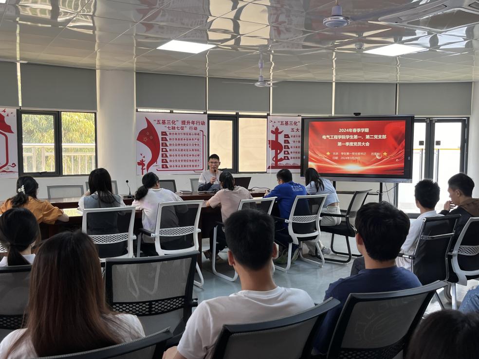 为深入学习贯彻全国两会精神,增强学院师生爱党爱国情怀,提升政治素养,担当时代重任,2024年3月29日,电气工程学院学生第一、第二党支部在明理楼206会议室召开2024年第一季度党员大会暨“全国两会精神”专题学习会。
