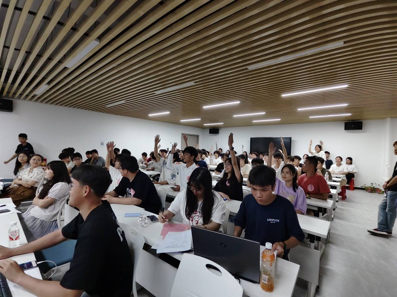 互动环节中,“听歌识曲”游戏点燃全场抢答热潮,五首经典旋律的片段播放瞬间点燃抢答热情,现场掌声与欢呼声此起彼伏。第二轮赛后,三位评委老师随机抽取幸运观众,送出定制文创礼品,现场惊喜连连,更将现场气氛推向沸点。此外,大赛还设置了观众投票环节,观众们通过扫码实时投票,票选“最佳台风奖”与“最具人气奖”,充分展现了“全民参与”的赛事特色。