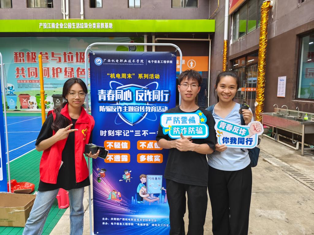 为切实增强学生防范电信网络诈骗的意识与能力,营造安全和谐的校园环境,4月27日,电子信息工程学院于江南校区A7楼下羽毛球场举办“机电周末”之“青春同心 反诈同行”防骗反诈主题宣传教育活动。活动吸引了江南校区两个学院的师生踊跃参与,来校学习的越南学生也积极参与其中。现场气氛非常热烈,同学们在趣味互动中学习反诈知识,筑牢自我保护的安全屏障。