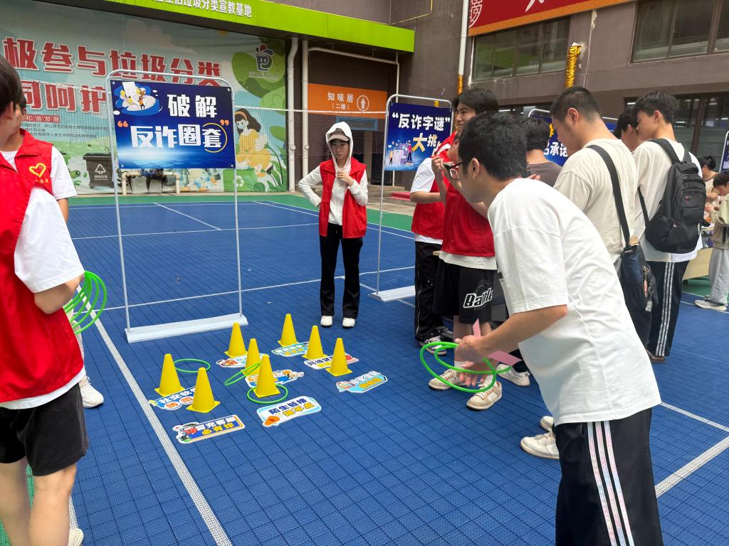 活动现场,“破解‘反诈圈套’”的套圈游戏吸引了众多同学的目光。工作人员别出心裁地将反诈知识与传统套圈游戏相结合,在场地中摆放多个反诈警示牌,“个人信息勿泄露”“社交软件防陷阱”“兼职刷单都是坑”等标语醒目可见。同学们手持套圈,全神贯注地瞄准目标,力求一击即中。每当有同学成功套中立牌,工作人员便立即针对立牌上的反诈警示语展开简要讲解与提醒。这种寓教于乐的方式,让同学们在欢声笑语中深刻认识到了各类诈骗手段的危害,防骗反诈的警钟在心中长鸣。
