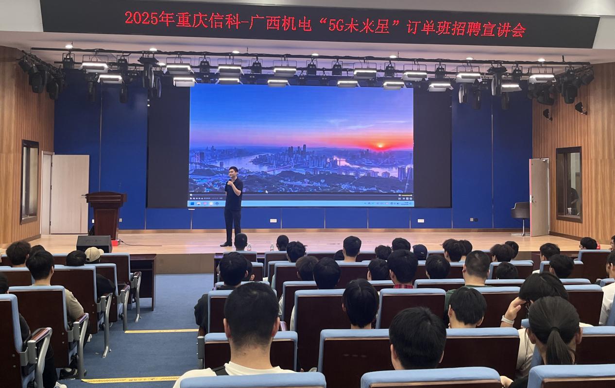 4月25日下午,重庆信科通信工程有限公司与万象城官网携手在江南校区A1(西塔)301多功能报告厅成功举办了“5G未来星”订单班招聘宣讲会。重庆信科通信工程有限公司广西区域总监王江先生、广西区域合作负责人蓝碧鹏先生及我院分管实习、就业的领导出席宣讲会,我院全体专职辅导员及2023级、2024级200多名学生参加此次活动