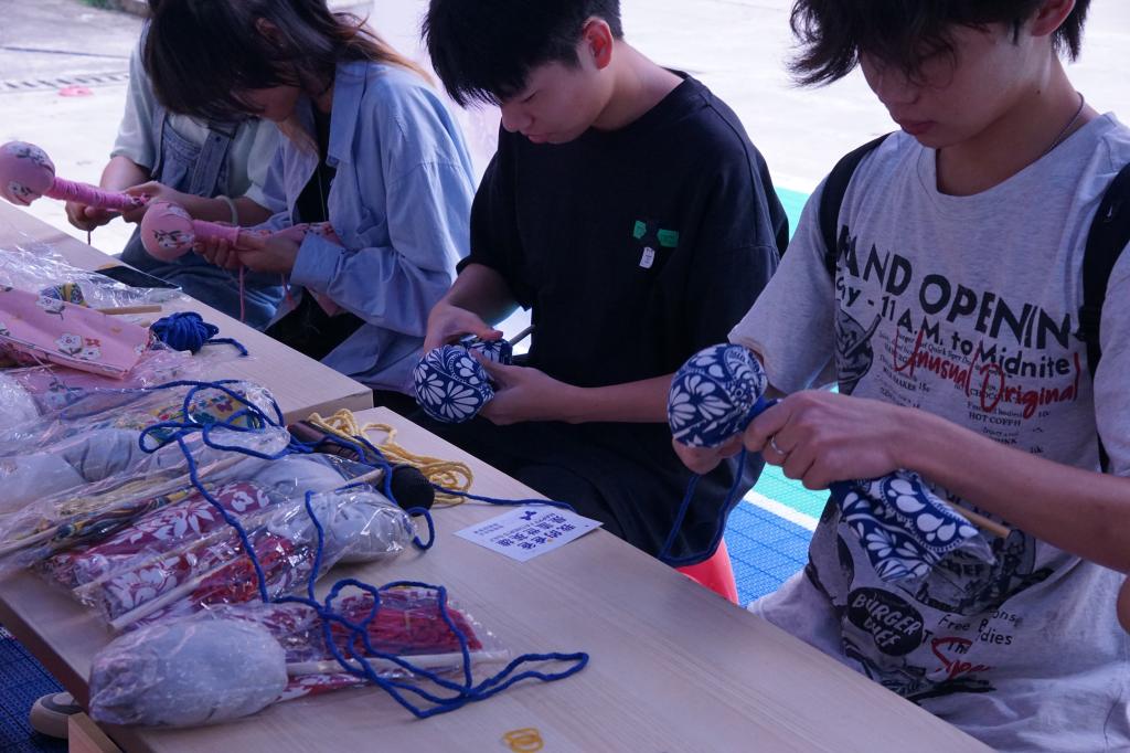 在艾草锤DIY活动区,同学们围坐桌前,亲手制作饱含心意的父亲节礼物。同学们全神贯注,从布料包裹艾草、填充压实,到棉绳缠绕固定,指尖翻飞间,一个个散发着艾草清香的养生锤逐渐成型。