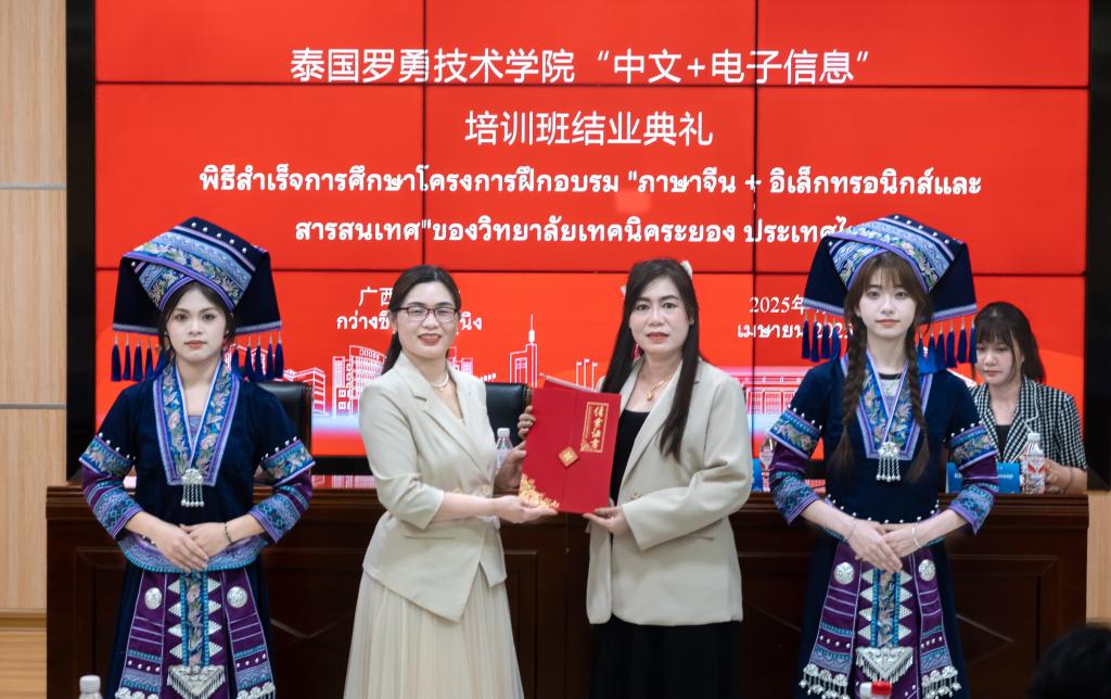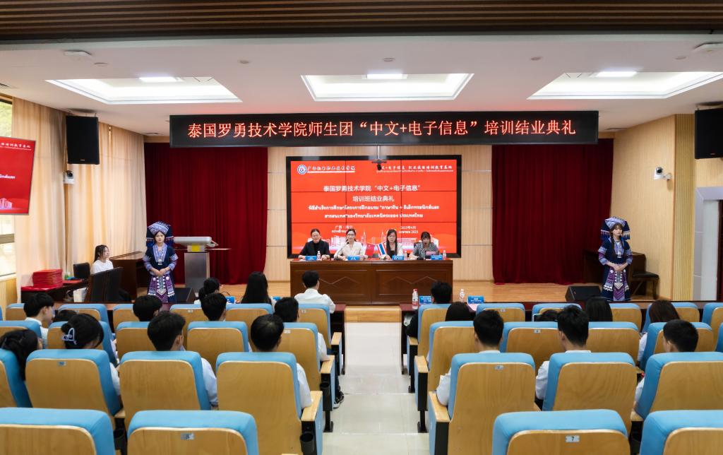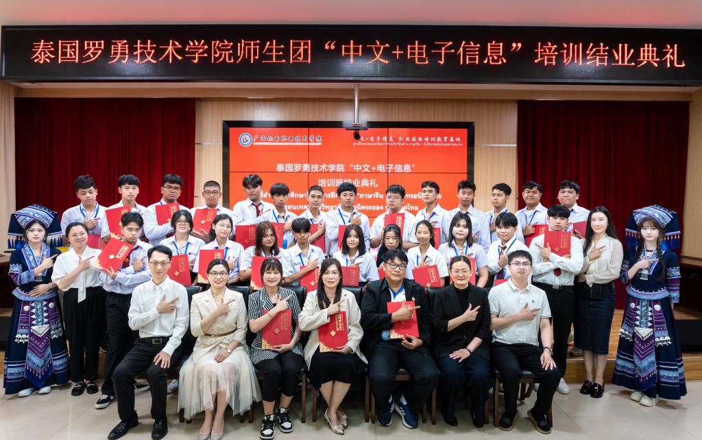 2025年4月25日,泰国罗勇技术学院“中文+电子信息”培训班结业典礼在万象城官网第二学术报告厅隆重举行。来自中泰两国的29名师生齐聚一堂,共同见证为期8天的融合文化交流与技术赋能的职业教育成果。国际教育学院、电子信息工程学院相关领导和教师出席典礼,电子信息工程学院副院长杨爱春主持典礼。