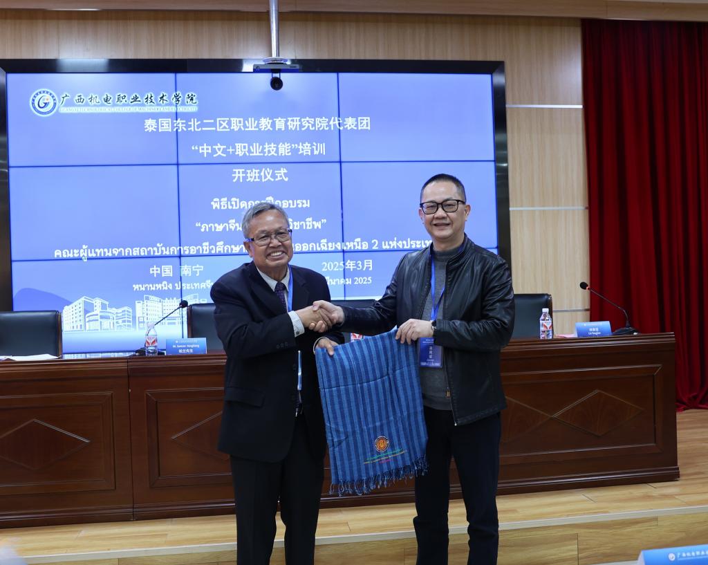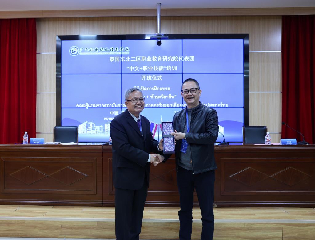 随着中泰双方代表互赠礼物的温馨时刻,本次开班仪式圆满落下帷幕。这份跨越山海的礼物交换,不仅承载着双方的真挚情谊,更凝聚着对职业教育交流的深切期许。当泰国友人接过凝结中华文化底蕴的精美礼赠,当中国老师捧起象征泰式风情的珍贵纪念,不同文明对话在指尖传递的温度中悄然绽放,这既是对"中泰一家亲"理念的生动诠释,更是中泰职业教育高质量融合发展的务实举措。
