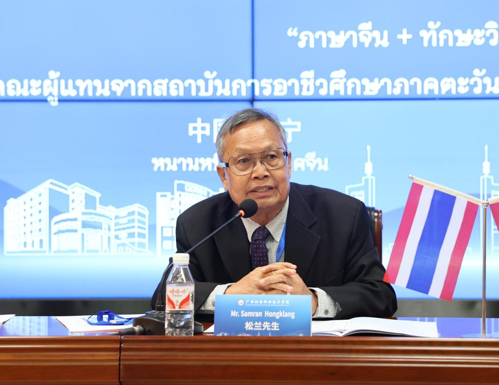泰国东北二区职业教育研究院松兰副院长在致辞中,表达了对awc77万象城官网的感谢。他表示,这是第四次与万象城官网合作交流,为中泰职业教育搭建了沟通对话桥梁。他希望,通过此次交流,在课程共建、师资互访、留学生联合培养等领域深入开展务实合作,为共同培育具有全球视野的技术技能人才贡献力量。
