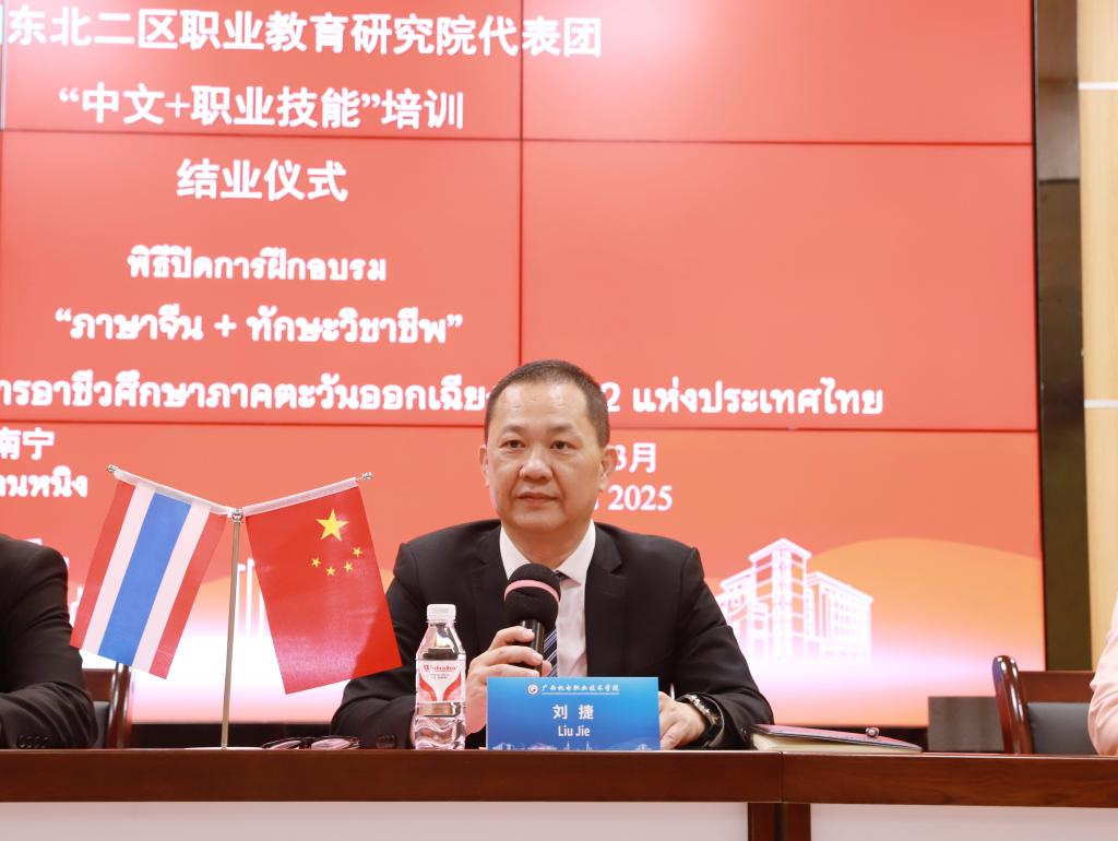 泰国东北二区职业教育研究院院长助理巴穆安作为学员代表发言,他对学校精心策划的“中文+职业技能”培训致以衷心的感谢,对培训内容与安排高度认可。他表示,通过此次培训,泰国学员们在教育、文化、生活等方面知行并进,满载而归,不仅提升了学员们的技术视野,更深化了双方在职业教育领域的合作。