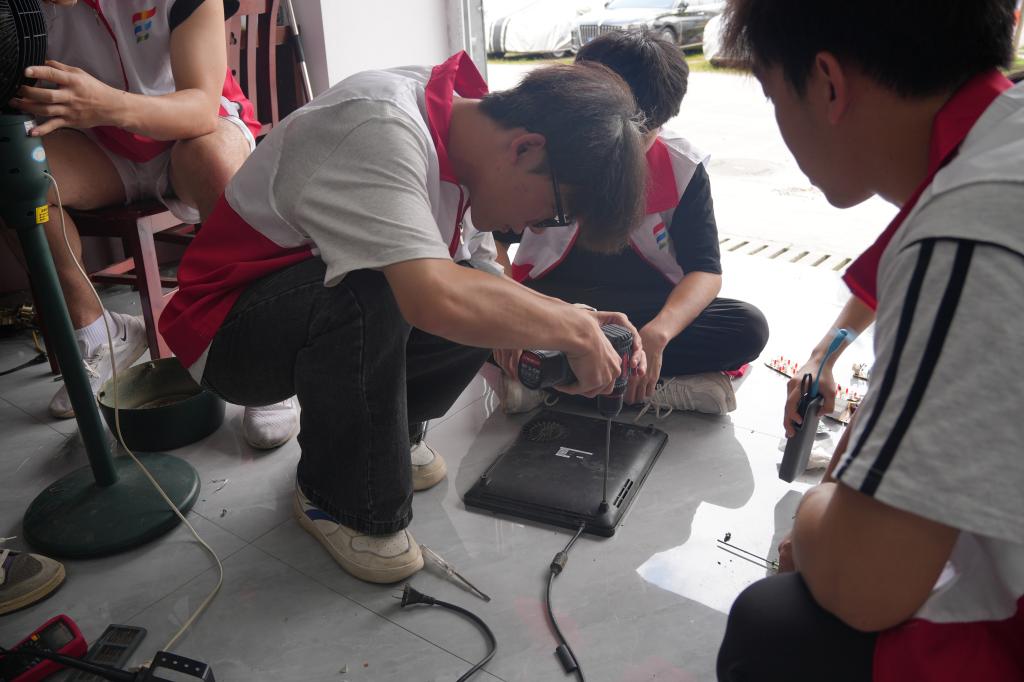 7月12日,实践团队深入凤山县思源街道思恩社区开展“维修下乡守初心,科技助农传真情”主题活动。在社区大会议室,师生们搭起“便民维修服务站”,为居民义务检修电饭煲、电风扇、电磁炉等家电30余件,并发放图文并茂的《安全用电手册》。“专家上门修电器,还教我们防触电方法,太贴心了!”社区居民韦阿姨连连称赞。团队创新开展“传帮带”式技能培训,通过“手把手教、点对点练”的方式,教授电路检测与故障排除实用技巧,切实提升居民自主维修能力。