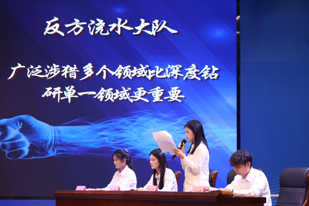 决赛现场,报告厅里气氛热烈而庄重。随着主持人宣布比赛开始,一场关于学风建设、学习方式等热点话题的辩论正式拉开帷幕。本次决赛辩题围绕“高校是否应该允许学生使用AI完成作业”、“深度钻研单一领域是否比广泛涉猎多个领域更重要”等议题展开,正反双方辩手各抒己见,展开了激烈的交锋。