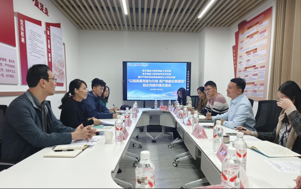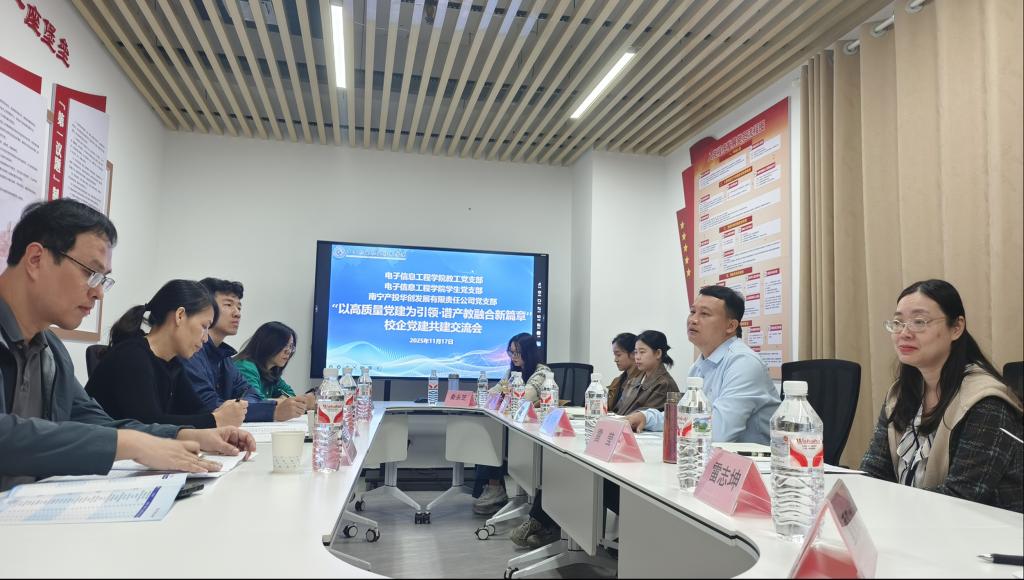 为深入贯彻落实新时代党的建设总要求,探索党建引领事业发展的新路径,深化产教融合、校企合作,2025年11月7日上午9:30,电子信息工程学院教工党支部、学生党支部与南宁产投华创发展有限责任公司党支部在江南校区A7-312会议室隆重举行了以“以高质量党建为引领·谱产教融合新篇章”为主题的校企党建共建交流会。双方代表齐聚一堂,共商合作大计,共绘发展蓝图。