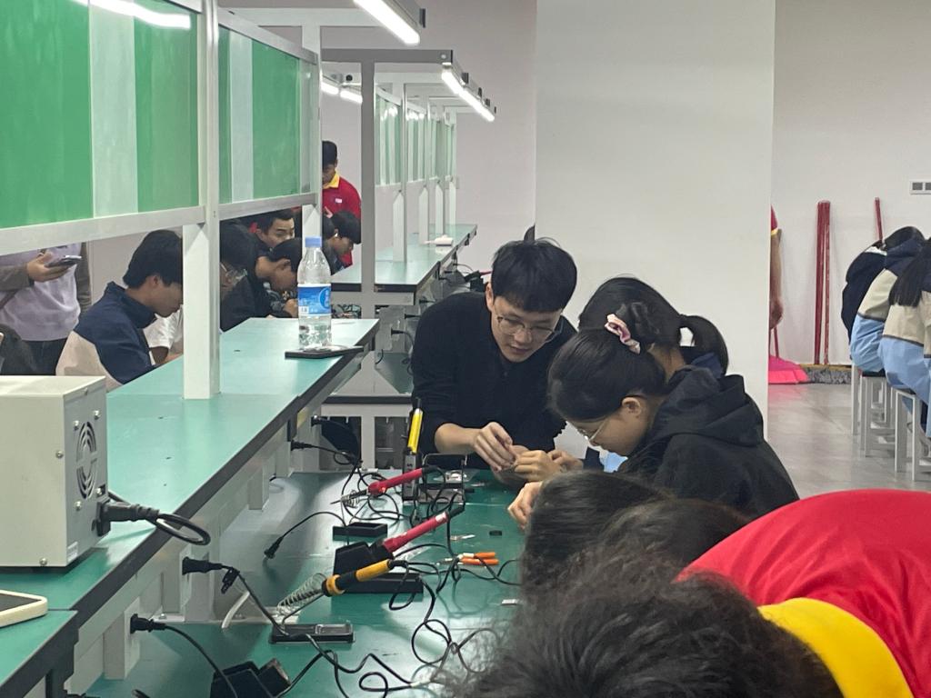 在活动中,党员教师向学生们详细讲解电阻、电容、二极管、LED 等常见元器件的识别方法、基本原理和实际应用场景,并手把手指导学生完成象鼻虫小制作电路焊接、组装与测试。在现场教学互动中,学生们积极参与,兴趣浓厚,通过亲自焊接电路板、点亮LED灯,组装象鼻虫等项目,体验电子制作的成就感,进一步激发了对电子信息技术的探索热情。党员教师们以严谨朴实的教学态度、耐心细致的技术辅导,充分展现了高校基层党组织服务育人的责任担当。