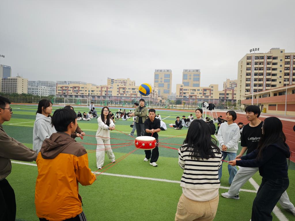 最后的“同心鼓”项目将活动推向高潮,学员们围站成圈,共同拉住鼓边绳索,齐心协力控制鼓面颠起排球,通过不断沟通调整力度与节奏,挑战着一次又一次的颠球纪录。