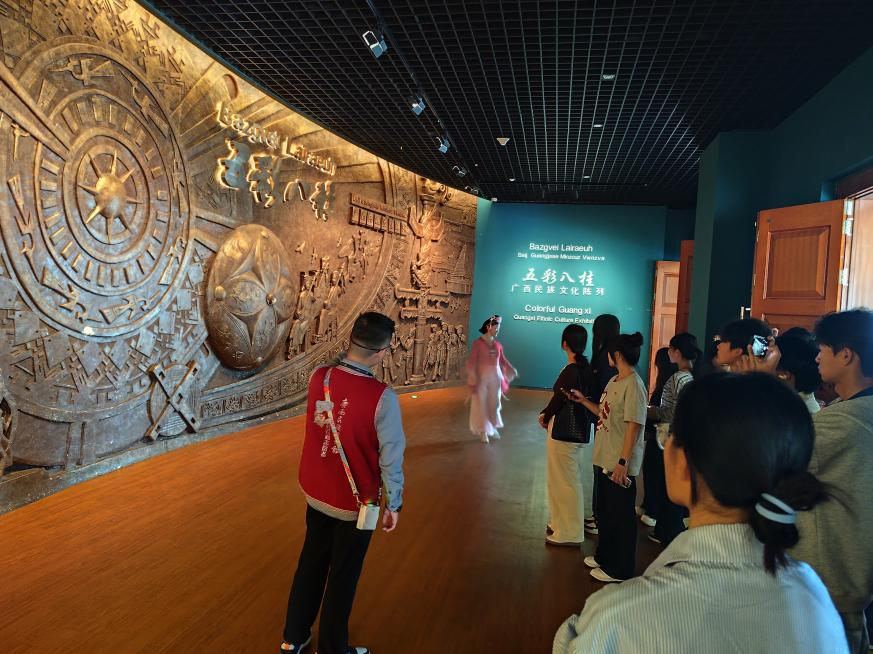 活动中,师生们重点参观了“五彩八桂”和“霓裳羽衣”两大展厅。在“五彩八桂”展厅,通过丰富的文物展品、详实的文字介绍和生动的场景复原,大家系统了解了广西各民族的历史渊源、文化传统和生活习俗,深刻感受各民族在漫长历史进程中相互依存、交融共生的紧密联系。步入“霓裳羽衣”展厅内,一件件精美绝伦的民族服饰令人目不暇接,从天然布料的选材考量,到精巧的刺绣技法与纹样设计,每一处细节都彰显着各民族人民的智慧结晶与独特审美。师生们驻足观赏、交流探讨,深入体会民族文化的独特魅力。