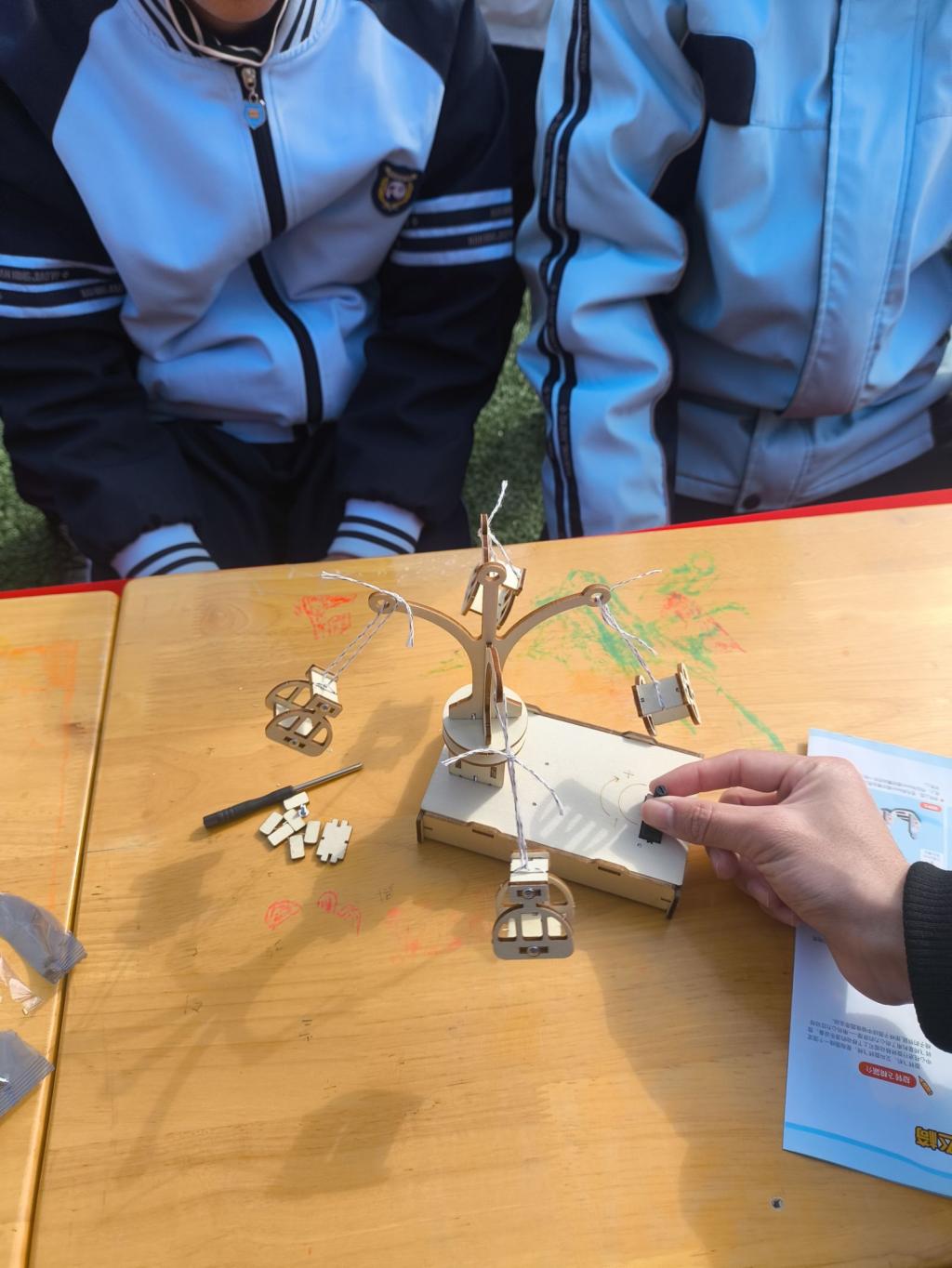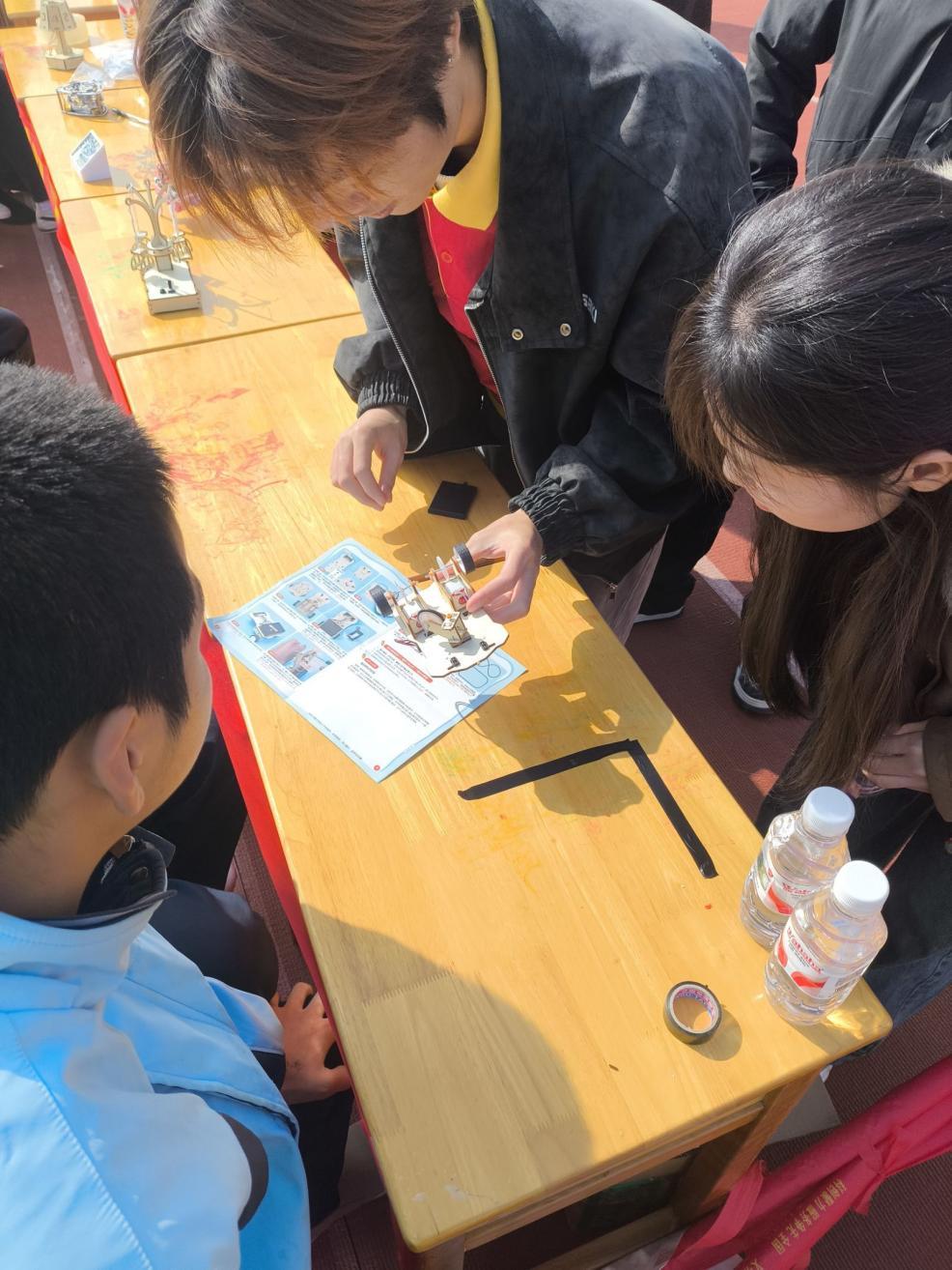 相较于静态展示,动手实操环节更是将现场气氛推向高潮。志愿者团队重点开展了智能语音控制灯笼、旋转飞椅、智能循迹小车等手工作品的制作指导。从元器件识别、电路连接到组装调试,志愿者全程耐心讲解、细致示范。同学们跃跃欲试,踊跃参与,在志愿者的悉心帮助下,一步步完成作品制作。当看到自己亲手组装的流水灯成功亮起、旋转飞椅欢快转动时,同学们的脸上洋溢着自豪与喜悦的成就感。此次活动共指导十余名同学完成手工作品制作,切实让他们体验到科技创作的乐趣,有效激发了探索科学的兴趣。