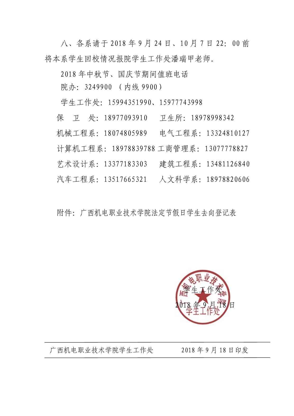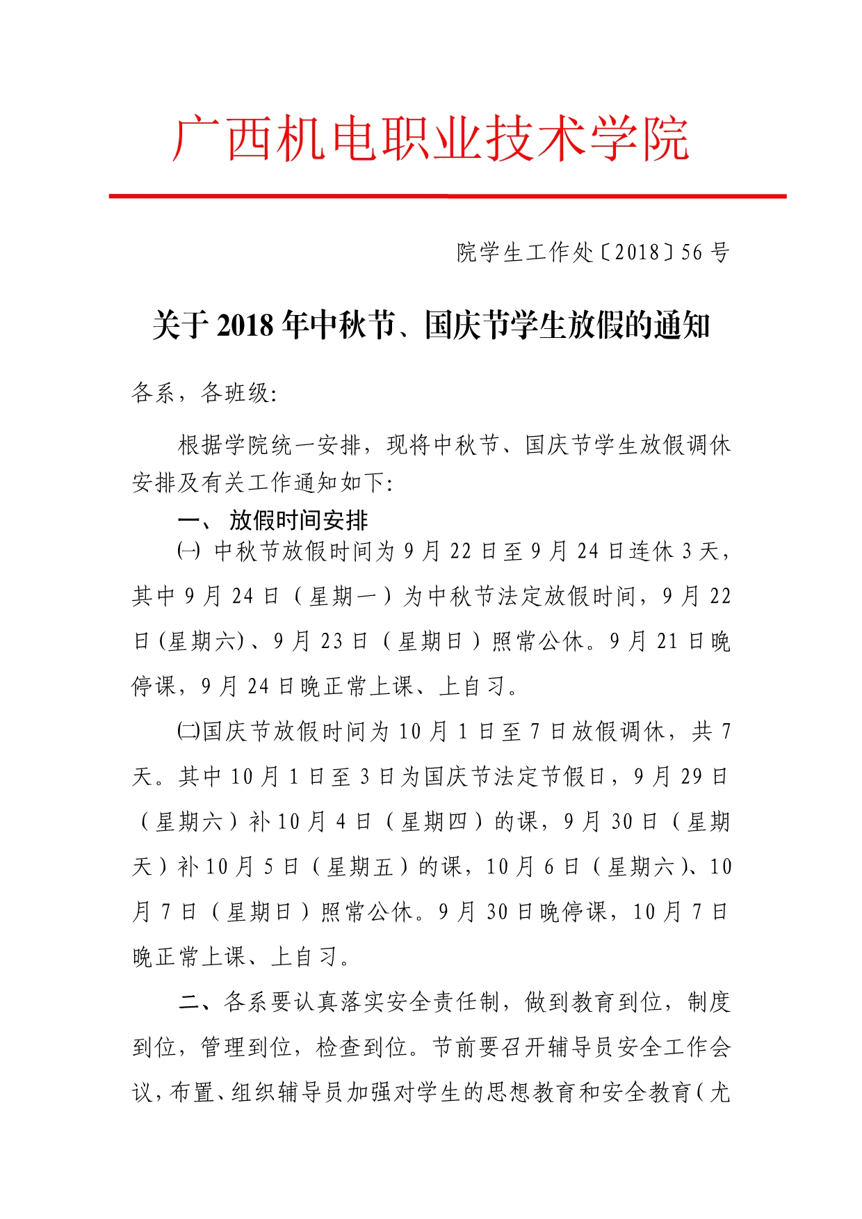 关于2018年中秋节、国庆节学生放假的通知