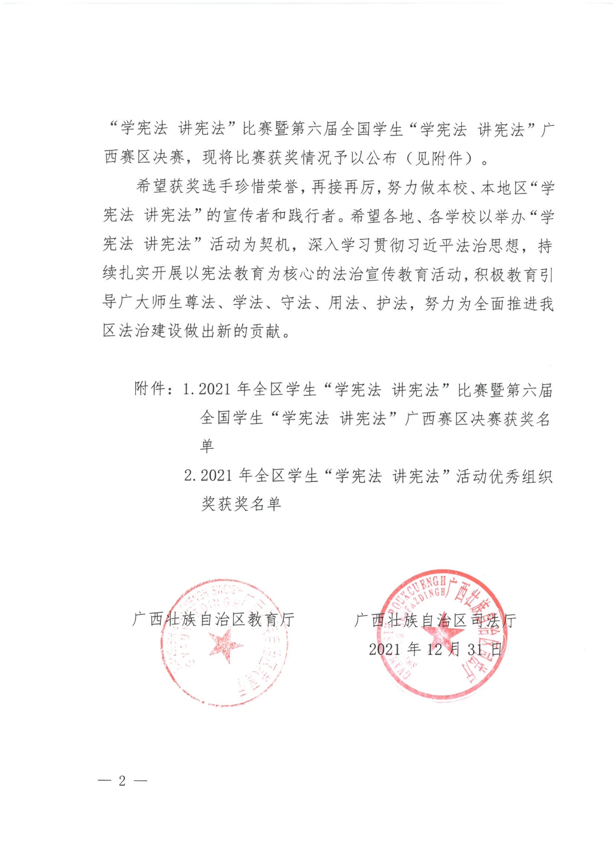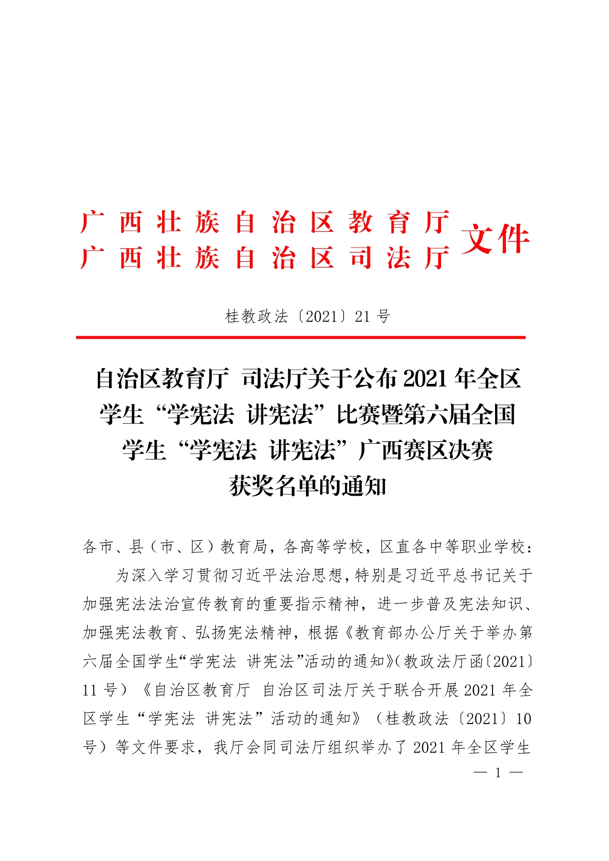 自治区教育厅司法厅关于公布2021年全区学生“学宪法讲宪法”比赛暨第六届全国学生“学宪法讲宪法”广西赛区决赛获奖名单的通知