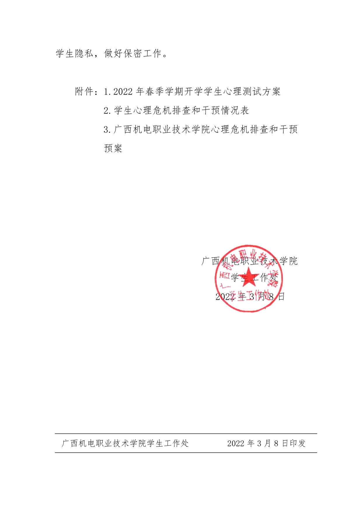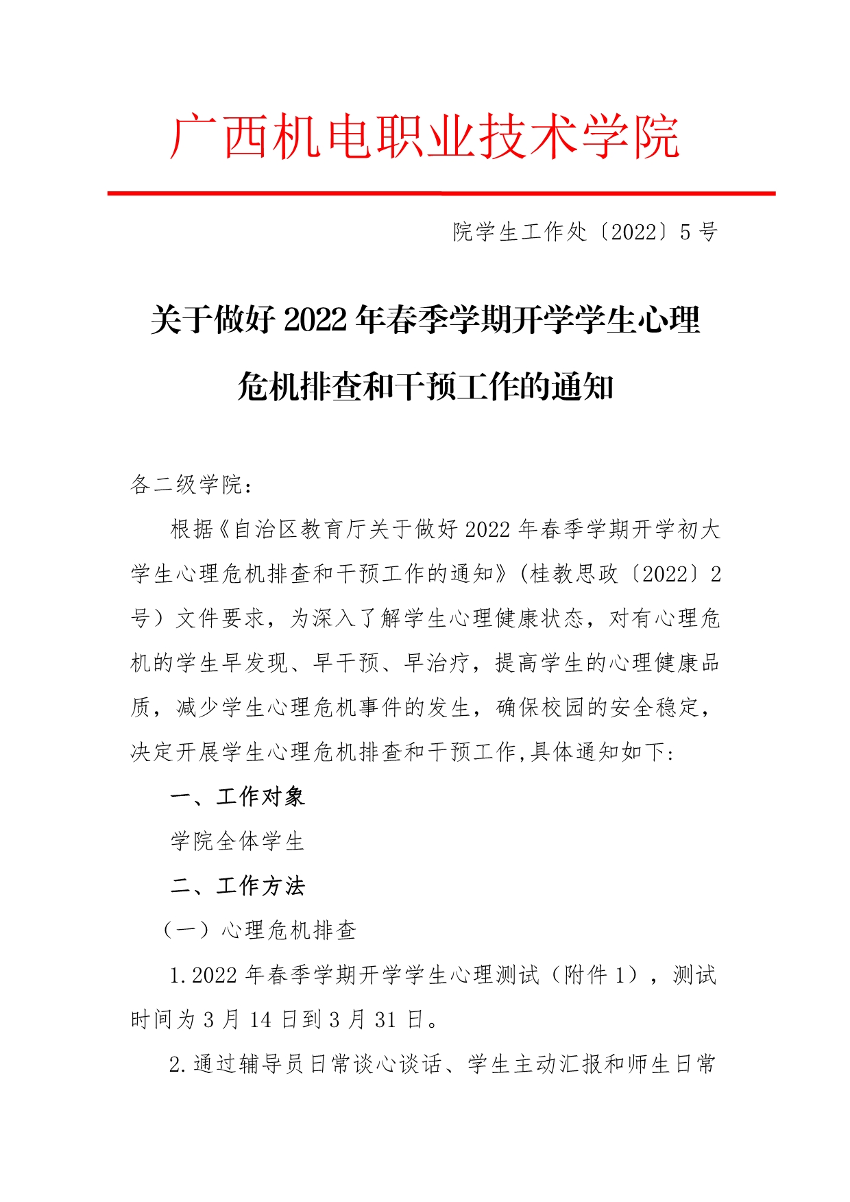 关于做好2022年春季学期开学学生心理危机排查和干预工作的通知