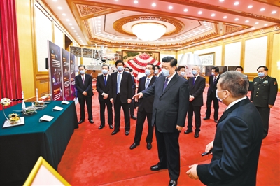 2月22日,党和国家领导人习近平、李克强、栗战书、汪洋、王沪宁、赵乐际、韩正等在北京人民大会堂会见探月工程嫦娥五号任务参研参试人员代表并参观月球样品和探月工程成果展览。这是习近平等在人民大会堂东大厅参观月球样品和探月工程成果展览。