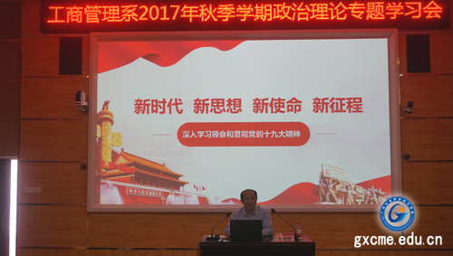 为深入学习领会党的十九大精神,用十九大精神统领各项工作,11月10日下午,学院党委副书记、纪委书记陈科鹤以“解读党的十九大精神”为题,为我院工商管理系全体党员、教师、学生党员发展对象、入党积极分子、和学生干部代表上了一堂生动的专题学习辅导课。