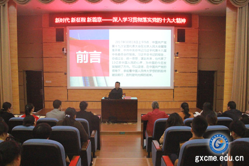11月28日下午,学院党委委员、副院长梁庆杰以“新时代、新征程、新篇章”为题,为计算机与信息工程系、人文科学系(公共教学部)全体教师作学习宣传贯彻党的十九大精神专题报告。