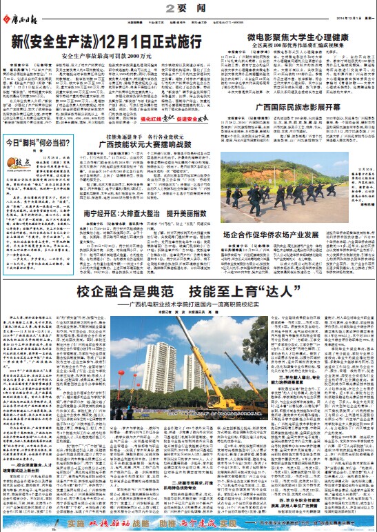 一批“校中厂”、“厂中校”破土而出:学院通过引企入校,共建校企合作利益共同体,建立了南宁市科创进口汽车维修有限责任公司机电职院快修分厂、南宁广发重工集团有限公司压力容器分公司机电职院分厂、鼎光机电职院电子教学工厂、春茂电气机电职院自动化设备生产车间、桂华机电职院快递中心等5家“校中厂”,并在南宁广发重工集团有限公司、广西桂华物流有限公司、广西昊晟国际物流有限公司、南宁鼎光电子有限公司、南宁多丽电器有限公司设立教学点等5家“厂中校”。有效促进了校企深度融合,实现了生产车间与教室合一、学生与学徒合一、教师与师傅合一、教学内容与工作任务合一、教学实践与生产科研合一、作业与产品合一、实训基地管理与企业管理合一、考核标准与职业标准合一;实现了学生双身份、教学双场所、课程双教师、实践双指导和校企利益的双丰收。让学生足不出校就能接触到一流的电力、电气、机械、汽车、工控产品等生产线和产品。进一步拓展学院与企业合作的深度和广度,共同培养更多企业需要的高端技能型人才。