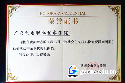 本次活动征集作品以社会主义核心价值观“富强、民主、文明、和谐;自由、平等、公正、法治;爱国、敬业、诚信、友善”24字表述为创作基本内容,更多体现南宁元素。活动得到了社会各界的广泛关注和积极参与,共收到区内外参赛作品近240幅,经主办方初选后确定235幅作品进入为期近一个月的网络展示及投票环节。据统计,此次网络投票累计票数达25万余票。经过在线投票、专业评审等多个环节,最终,确定入选《我心目中的社会主义核心价值观》漫画图册的作品40幅,我院两名同学的作品在众多作品中脱颖而出,成功入选。