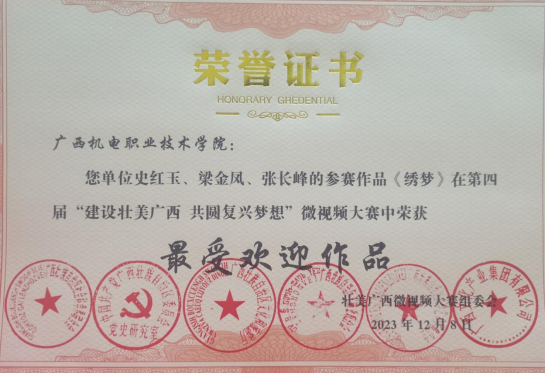 近日,由自治区社科联、自治区党委党史研究室、自治区文化和旅游厅、自治区工商联、自治区文联、广西文产集团等六部门联合举办,广西电影集团、广西电影集团有爱影业有限公司承办的第四届“建设壮美广西,共圆复兴梦想”微视频大赛颁奖典礼在南宁举行,由万象城官网公共管理学院教师史红玉、梁金凤、张长峰等联合创作的主题微电影《绣梦》荣获“最受欢迎作品奖”。