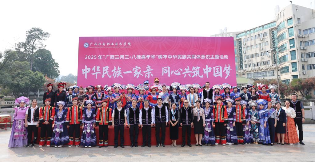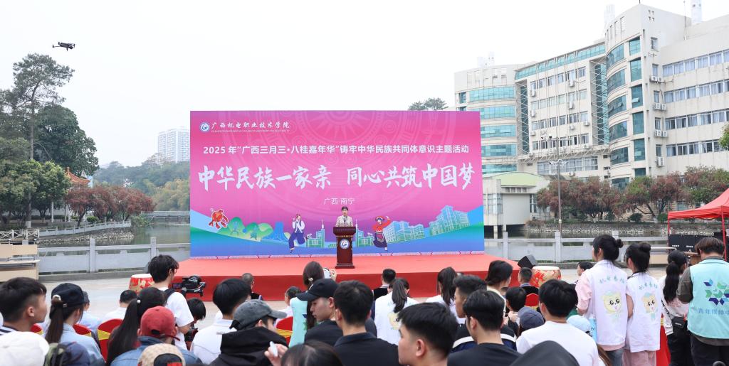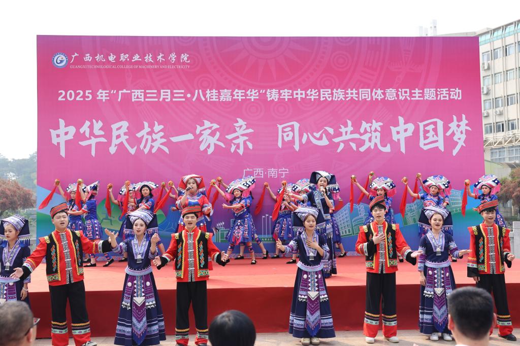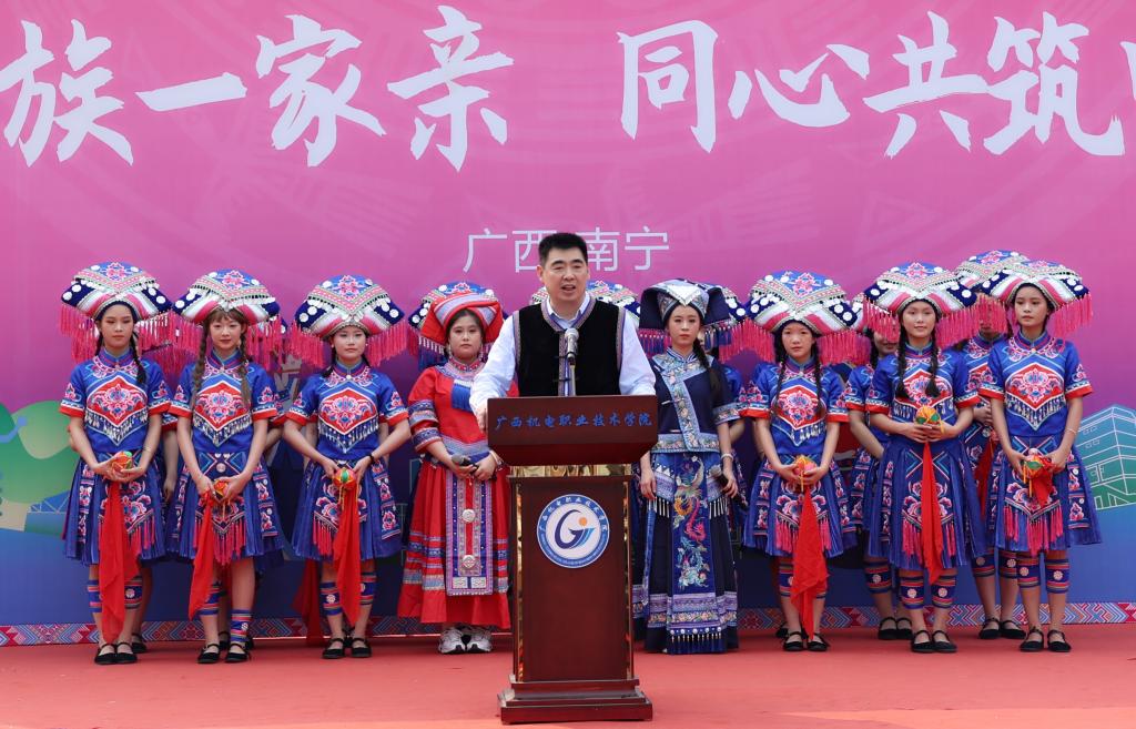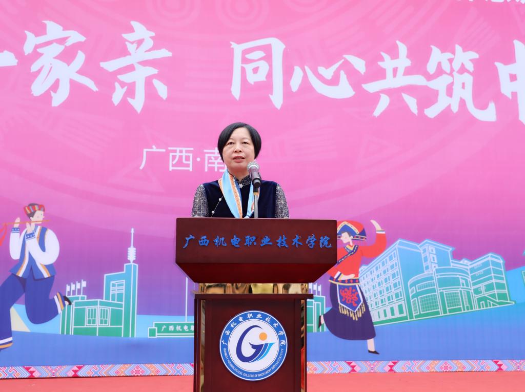 程云燕致开幕词,她代表学校向参与活动的每一位同学致以节日的问候与最美好的祝福,向悉心策划此次活动的全体师生表达最诚挚的谢意。她表示,“三月三”作为国家级非物质文化遗产,是壮乡人民最隆重的节日之一,它不仅是壮族祭祀祖先、倚歌择配的传统节日,更承载着我们八桂大地悠久的历史文化,凝聚着广西各族人民深厚的情感,蕴含着中华民族深厚的文化内涵。我们以“广西三月三·八桂嘉年华”为平台,举办铸牢中华民族共同体意识主题活动,目的是让师生们深刻体验中华民族多元一体的文化魅力,进一步增强对中华民族大家庭的认同感与归属感,共同绘制民族团结的壮美画卷。多年来,学校致力于培养具有家国情怀、民族精神和国际视野的高素质技术技能人才,将铸牢中华民族共同体意识教育融入学校的育人体系,引导同学们不断加强对伟大祖国、中华民族、中华文化、中国共产党、中国特色社会主义的认同感,提升中华民族文化自信和民族团结进步的使命感,校园文化内涵不断丰富拓展,机电学子的青春风貌持续昂扬向上。期望每位老师和同学带着满腔热情和开放心态,踊跃参与各项活动。通过体验来学习,通过学习来感悟,通过感悟来成长。