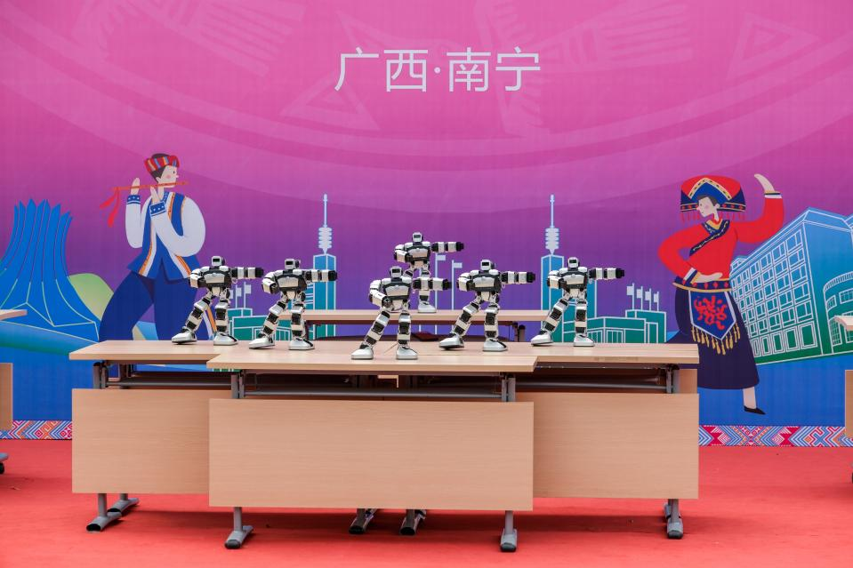 醒狮欢腾,祥龙翩跹,“狮跃鼓鸣民族大联欢”民族文体汇演点燃了开幕式现场激情。机器人表演《AI三月三》融合了现代科技与传统民族文化之美,舞蹈《锣鼓声响》将民族力量展现得淋漓尽致,台上台下演员同唱《壮族敬酒歌》,展现出了中华民族团结一心、和谐共融的美好景象,将气氛推上高潮。