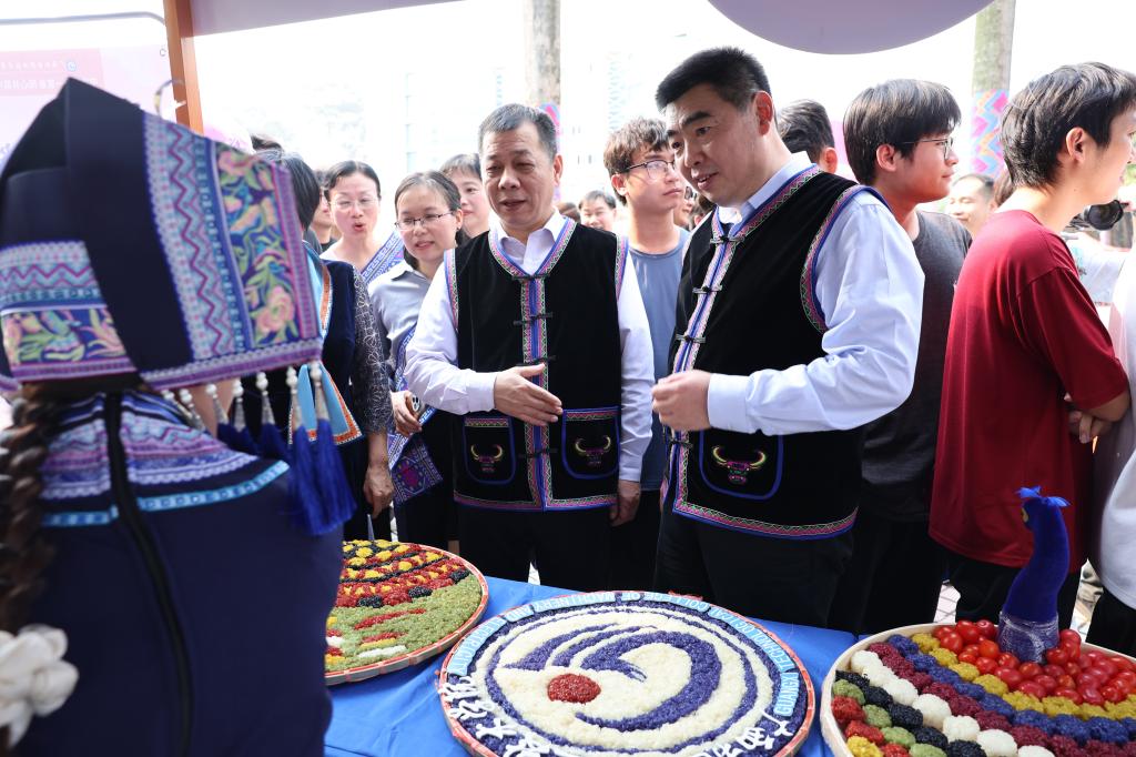 开幕式后,师生们共同来到民族文化街市品美食,体验民俗活动。据了解,本次主题活动在相思湖校区和江南校区同时进行,融合“民族风情”和“工匠特色”理念,共设民俗文化街市、山歌对对唱、少数民族传统体育运动会等活动板块,通过品尝五色糯米饭、艾叶糍粑等壮乡民族特色美食、体验团扇、书签、扎染等非遗文化民俗工艺品制作、投壶、套圈、花艺、茶艺等全新文创+游戏体验、山歌对唱、竹竿舞、高杆绣球、高脚马竞赛等文体项目,不仅让广大师生尽情领略到“三月三”民族文化魅力,全方位、多领域感受八桂壮乡的“最炫民族风”,进一步强化民族团结理念,也让在校学习的越南留学生和泰国代表团感受壮乡人民的欢乐与热情,感受中国文化魅力。