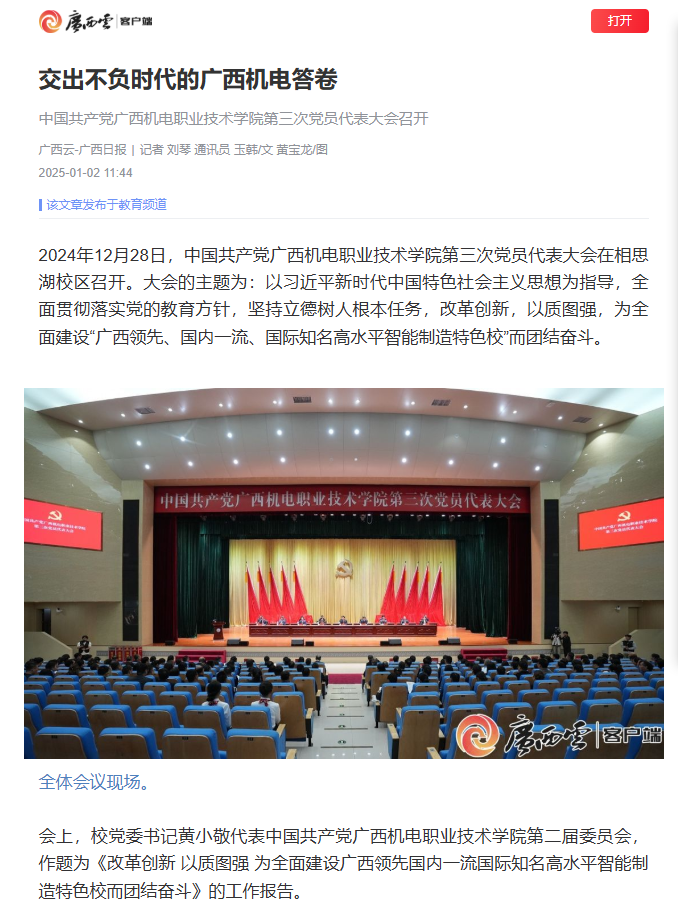 编者按:1月2日,广西云-广西日报以《交出不负时代的广西机电答卷 中国共产党awc77万象城官网第三次党员代表大会召开》为题刊发文章,报道了万象城官网在2024年12月28日召开的第三次党员代表大会。