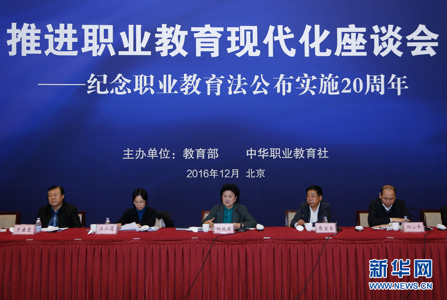 新华社北京12月2日电 推进职业教育现代化座谈会12月2日在京召开。中共中央政治局常委、国务院总理李克强作出重要批示。批示指出:加快发展现代职业教育,对于发挥我国人力和人才资源巨大优势、提升实体经济综合竞争力具有重要意义。在各方面共同努力下,近年来职业教育改革发展取得了显著成就,应予充分肯定。“十三五”时期,希望围绕贯彻党中央、国务院重大战略部署,落实新发展理念,切实把职业教育摆在更加突出的位置,加快构建现代职业教育体系。坚持面向市场、服务发展、促进就业的办学方向,进一步深化改革创新,强化产教融合、校企合作,积极鼓励和支持社会力量参与,努力建成一批高水平的职业学校和骨干专业,加快培育大批具有专业技能与工匠精神的高素质劳动者和人才,深度融入大众创业、万众创新和“中国制造2025”的实践之中,促进新动能发展和产业升级,带动扩大就业和脱贫攻坚,为推动经济保持中高速增长、迈向中高端水平作出新贡献。中共中央政治局委员、国务院副总理刘延东出席会议并讲话。她强调,要深入贯彻党中央、国务院决策部署,认真落实李克强总理重要批示,加快推进职业教育现代化,使职业教育在决胜全面小康进程中发挥更加突出的作用。