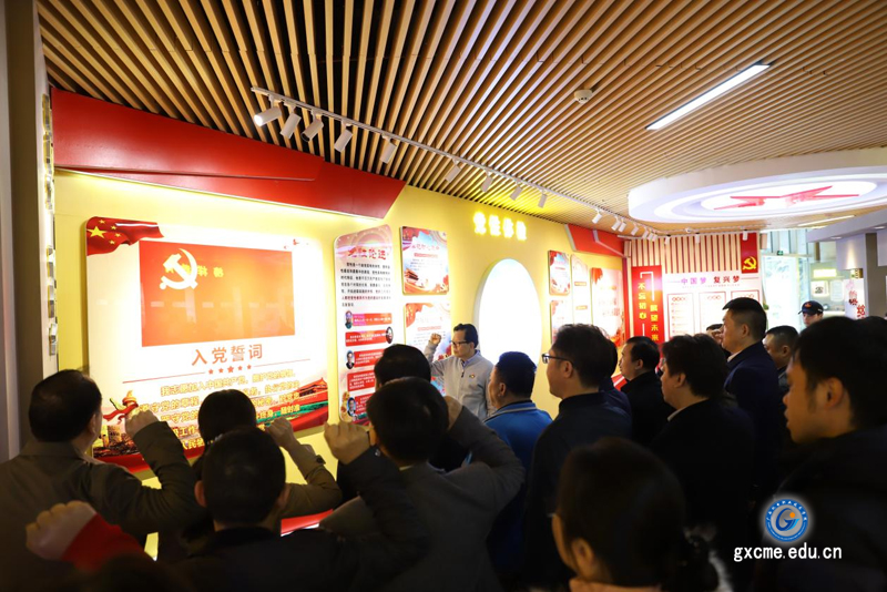 活动之初,大家跟随讲解员,参观了高峰林场党性教育基地。全体党员通过观看图片资料、实物等,共同回顾了党的历次代表大会的光辉历史、广西党史以及优秀共产党员先进事迹,了解革命先烈带领人民作战、生活、生产的场面与党史事实,深切感受到了老一辈革命家高瞻远瞩的战略眼光与英勇无畏的革命斗争精神,接受了一次生动而深刻的革命传统教育的洗礼。随后,学校党委书记梁辉带领党员们重温入党誓词,全体党员佩戴党徽,举起右手、握紧拳头,庄严宣誓。铿锵有力的誓言表明了大家坚守初心、忠诚于党、立足岗位、坚定为党的教育事业努力奋斗的信念和决心。