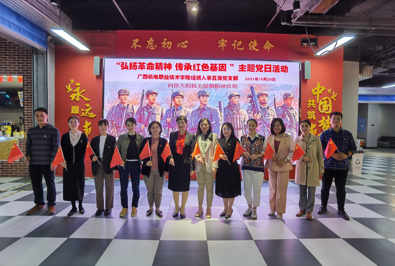 为庆祝中国共产党成立100周年,纪念抗美援朝战争爆发71周年,激发支部党员顽强的战斗精神、不屈不挠的奋斗精神,10月28日下午,组织人事直属党支部全体党员到南宁经济技术开发区两新领域电影党校开展“弘扬革命精神 传承红色基因”主题党日活动。