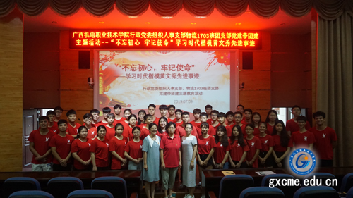 为深入学习时代楷模黄文秀的先进事迹,号召广大党员、青年团员以黄文秀同志为榜样, 7月9日下午,学院行政党委组织人事支部和物流1703班全体同学在学术报告厅开展了“不忘初心、牢记使命”——学习时代楷模黄文秀先进事迹的党建带团建主题活动。
