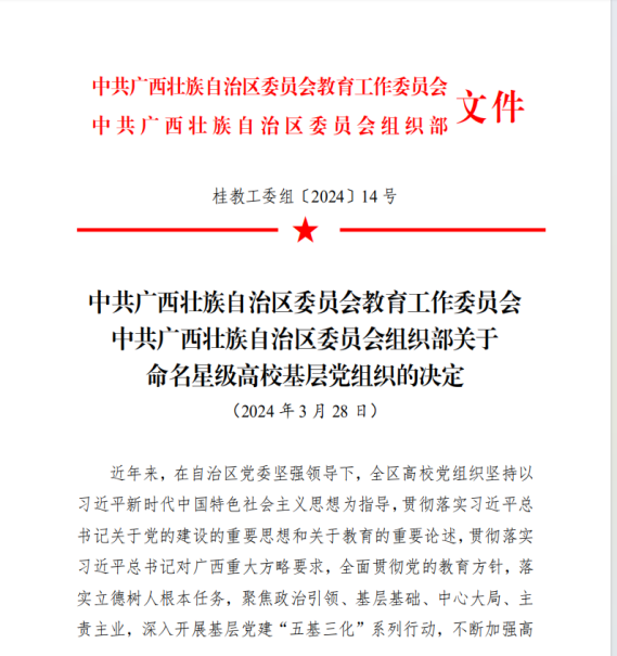 近年来,学校党委坚持以习近平新时代中国特色社会主义思想为指导,全面贯彻落实党的教育方针和习近平总书记对广西的重大方略要求,落实立德树人根本任务,聚焦政治引领、基层基础、中心大局、主责主业,深入开展基层党建“五基三化”系列行动,建立健全“1481N”的“党建引领”“四个工程”和“八个一”的党建工作机制,持续深化“党建+”“一支部一品牌”和“一院一特色”等党建品牌建设,不断增强基层党组织的政治功能和组织功能,扎实推动全校基层党组织全面进步全面过硬。特别是在学习贯彻习近平新时代中国特色社会主义思想主题教育中,紧扣“学思想、强党性、重实践、建新功”总要求,突出以学铸魂、以学增智、以学正风、以学促干,引导师生党员在推动学校发展、教学科研攻关、人才培养中担当作为,涌现出一批工作成效突出、示范效应好、带动作用强的党组织,切实发挥党建引领作用,实现以高质量党建引领学校事业高质量发展。