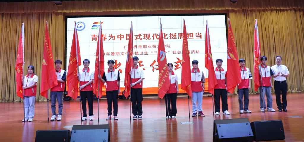 7月13日,学校举办了2024年广西大学生暑期文化科技卫生“三下乡”社会实践活动出征仪式。此次“三下乡”社会实践活动,紧扣“青春为中国式现代化挺膺担当”这一实践主题,围绕红色精神传承、新质生产力实践、就业创业实践、乡村振兴助力、基层治理观察、健康中国建设等方面,从全校申报的实践团队中遴选出了12支校级重点团队,组织奔赴基层,让青年学生在社会课堂中受教育、长才干、作贡献,争做有理想、敢担当、能吃苦、肯奋斗的新时代好青年。活动现场,重点团队接旗出征,拉开了此次实践的帷幕。