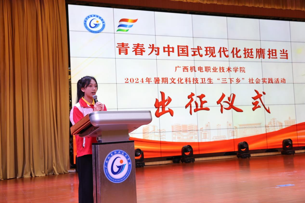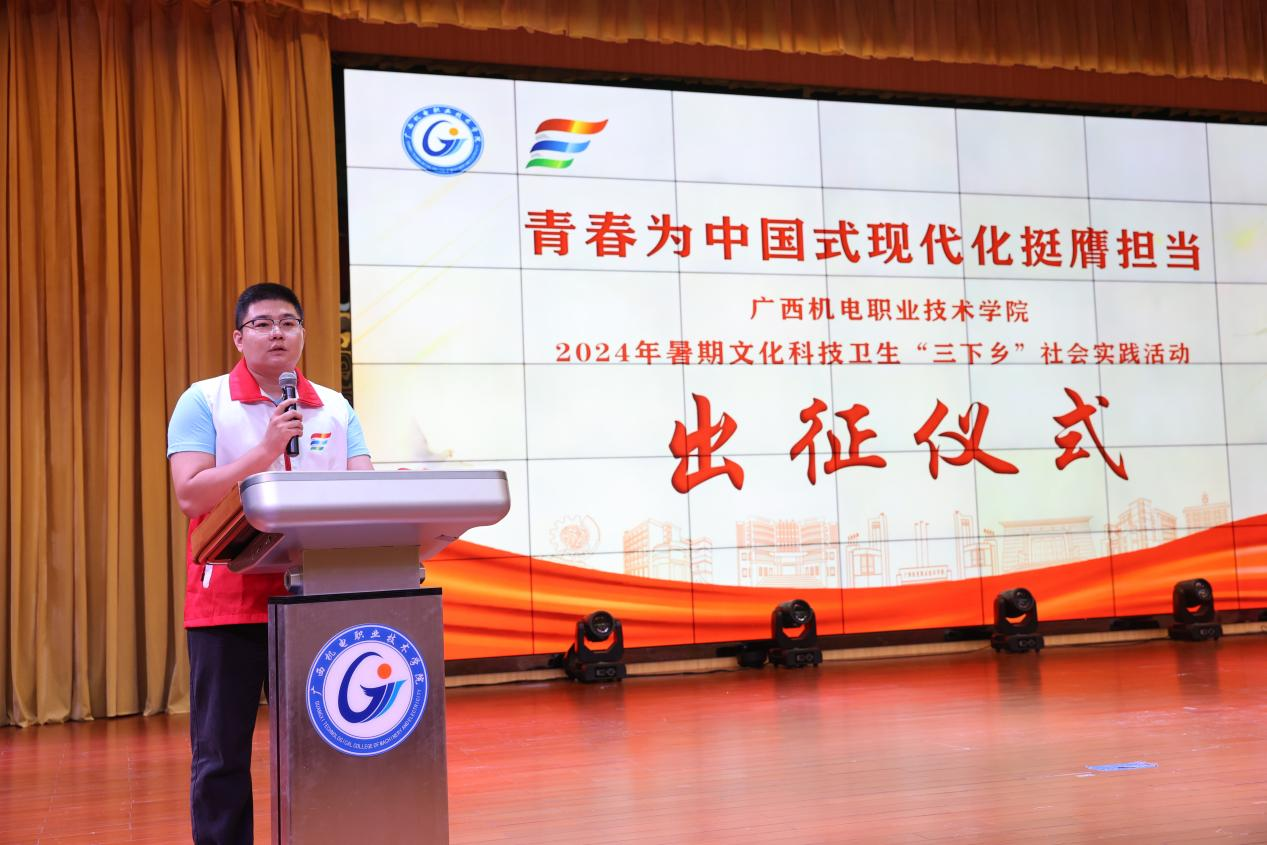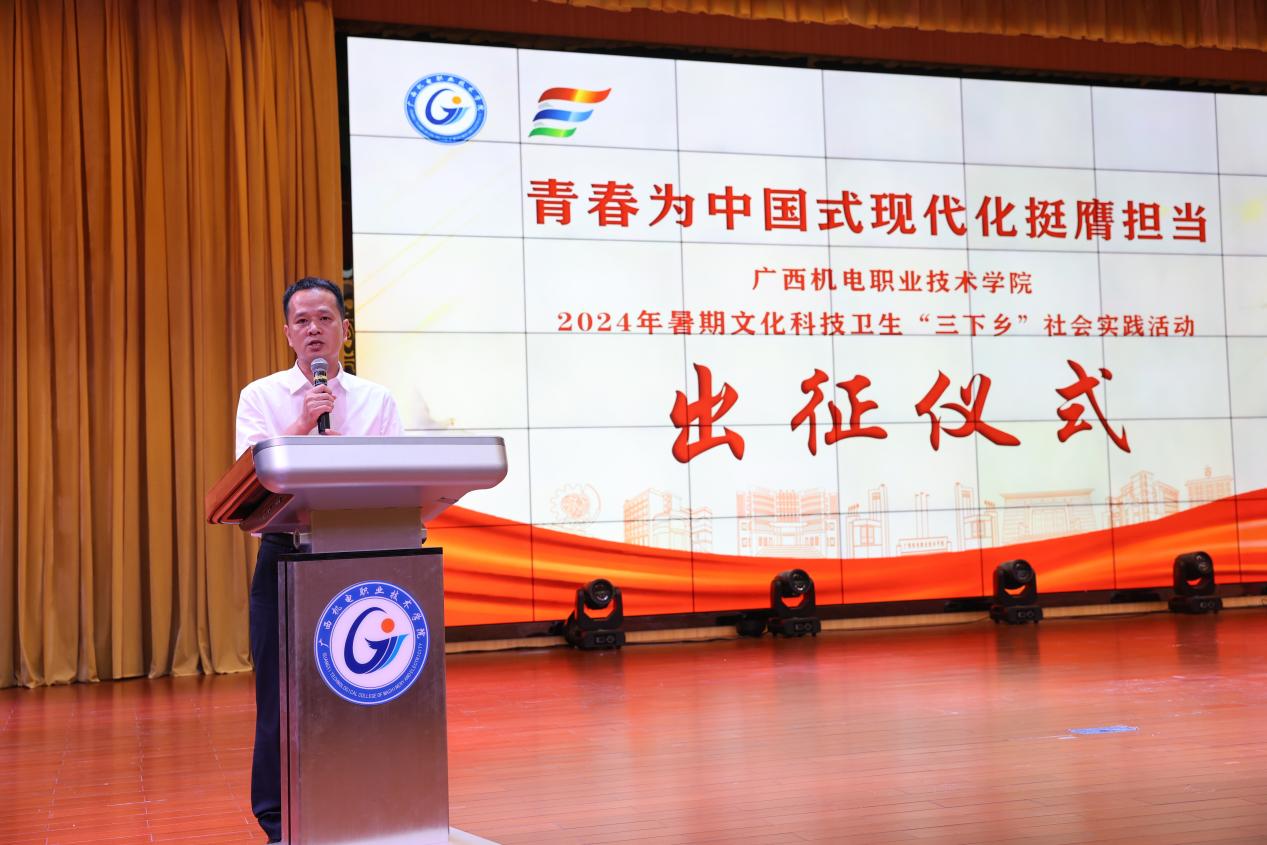 7月12日上午,学校2024年大学生暑期文化科技卫生“三下乡”社会实践活动出征仪式在博远楼小礼堂举行。学校副校长黄振宣出席仪式并讲话。校团委书记韦世友主持仪式。