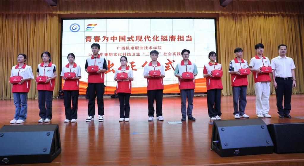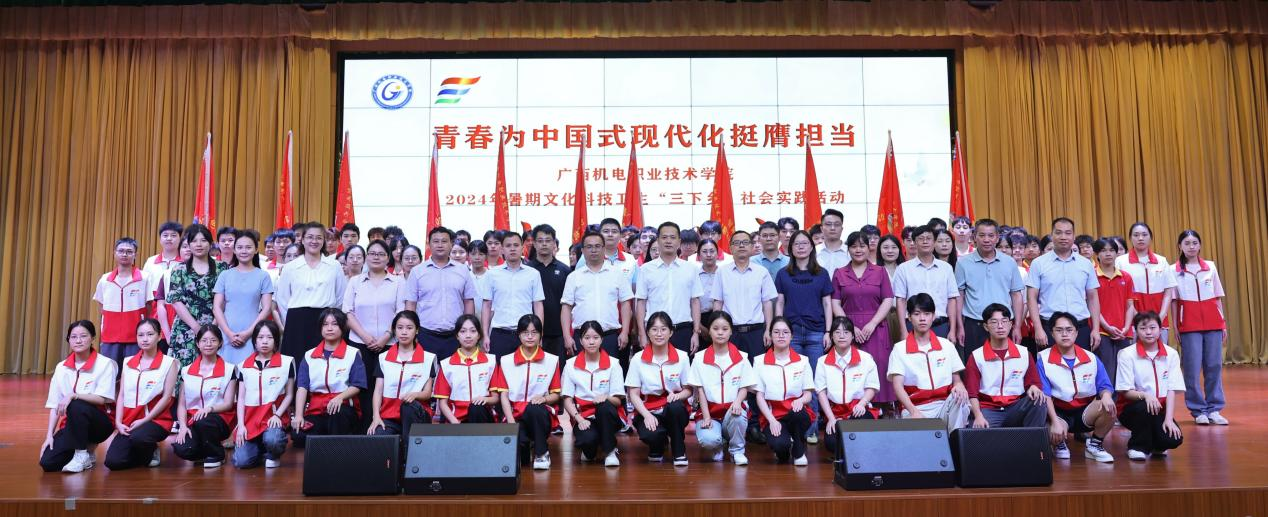 党委宣传部、党委学生工作部、二级学院负责人,“三下乡”社会实践团队师生,团委全体成员参加出征仪式。