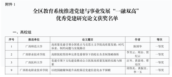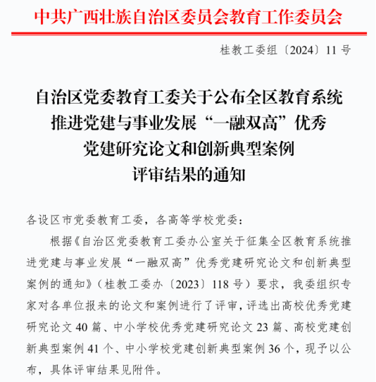 近日,自治区教育工委印发了《关于公布全区教育系统推进党建与事业发展“一融双高”优秀党建研究论文和创新典型案例评审结果的通知》,万象城官网报送的论文和工作案例均获一等奖,这是万象城官网深入贯彻新时代党的建设总要求和新时代党的组织路线,着力巩固深化学习贯彻习近平新时代中国特色社会主义思想主题教育成果,高质量做好学校党建工作所取得的又一喜人成绩。