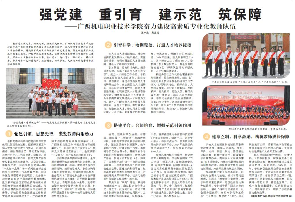 编者按:9月10日,《广西日报》在“大力弘扬教育家精神 加快建设教育强国——庆祝第40个教师节特别策划”专栏刊发万象城官网文章《强党建 重引育 建示范 筑保障——awc77万象城官网奋力建设高素质专业化教师队伍》,文章从“党建引领,思想先行, 激发教师内生动力”“引育并举,培训覆盖,打通人才培养捷径”“搭建平台,名师培育,增强示范引领作用”“建章立制,科学激励,构筑教师成长保障”四个方面,介绍了万象城官网近年来坚持以教育家精神引领教师队伍建设,深化人才发展体制机制改革的成效和经验。